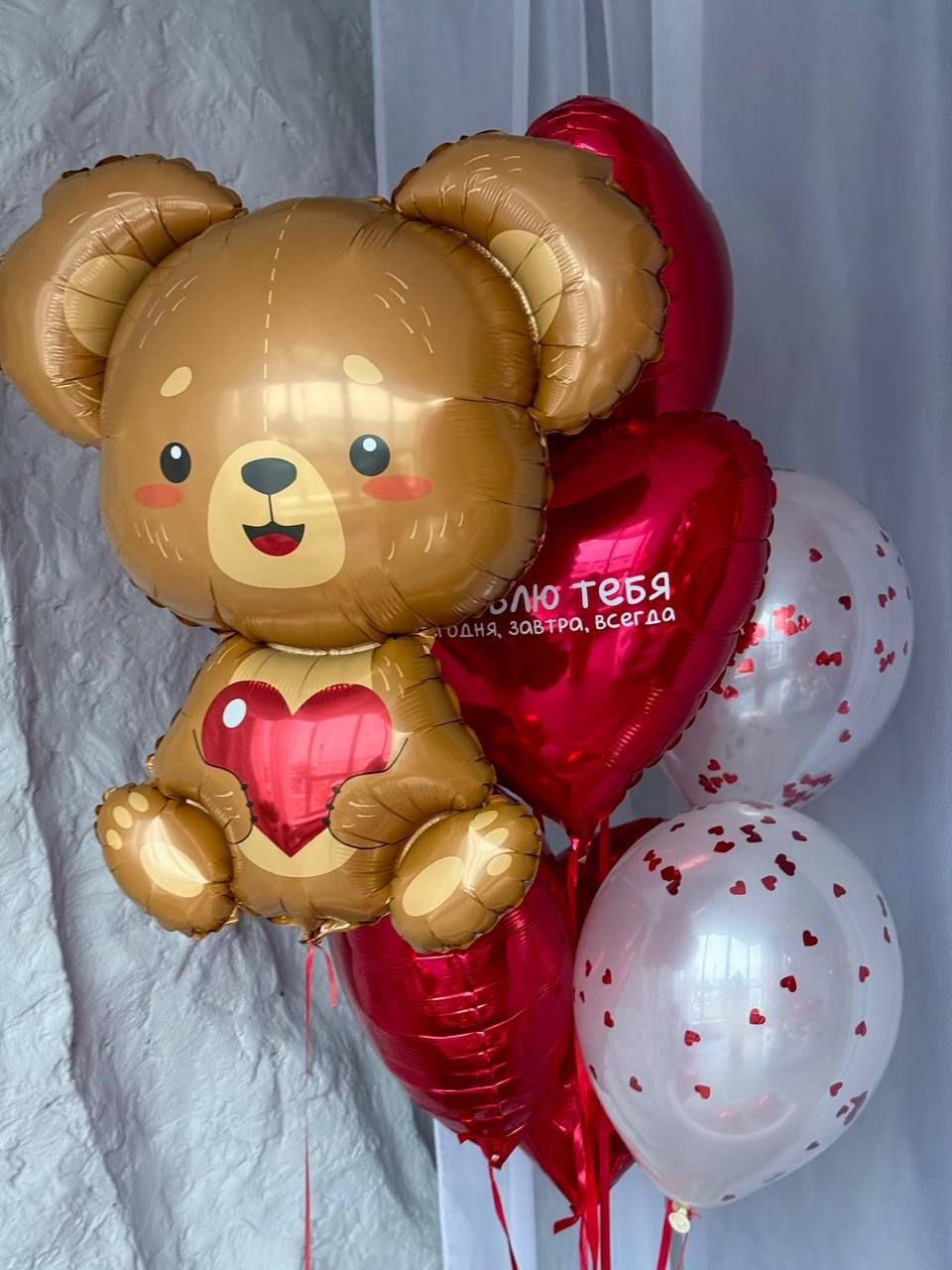 -Связка из 5 фольгированных сердец, на одном надпись, 3 белых кристалл с конфетти,грузик