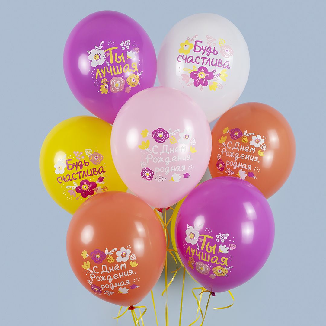 Шары С Днем Рождения, Будь Счастлива это тематические воздушные шары, накачанные гелием. Шары одного цвета из набора не выбираем — берём максимально разные по наличию.