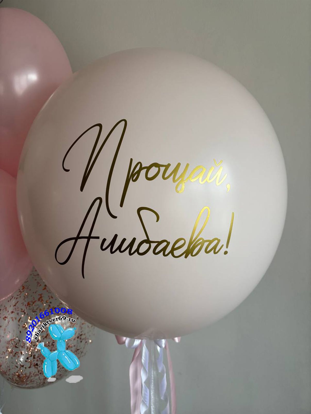 Шар гигант с индивидуальной надписью и декором тассел, внутри которого спрятано фольгированное сердце 45см с индивидуальной надписью и конфетти. Оба шара наполнены гелием.