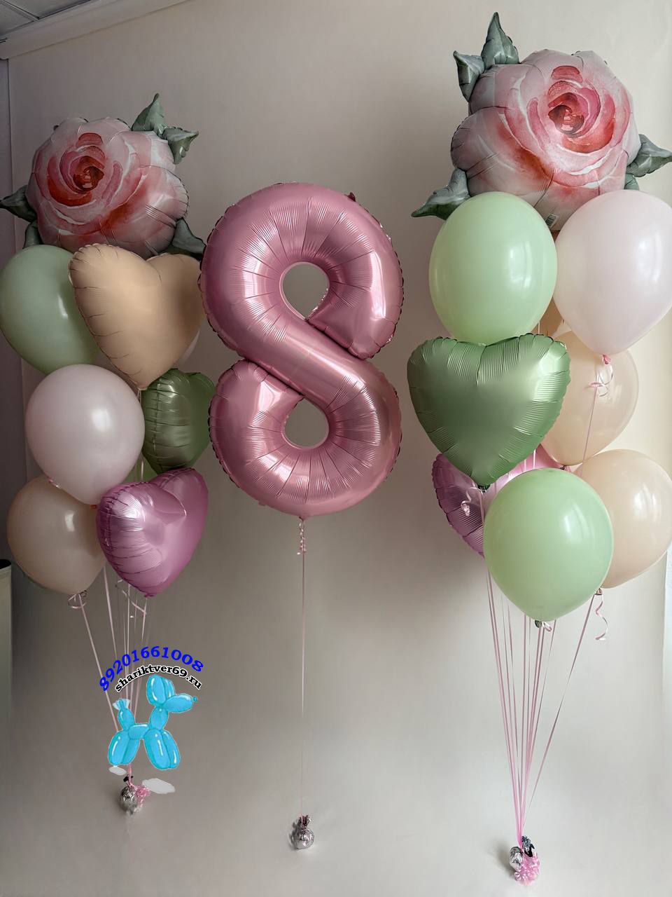 В набор входят фольгированная цифра 8, шары в форме сердец и латексные гелиевые шары, собранные в гармоничную композицию. Такое оформление красиво смотрится в интерьере, подходит для фотозоны и станет эффектным дополнением к цветам или подарку.